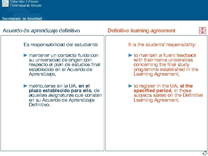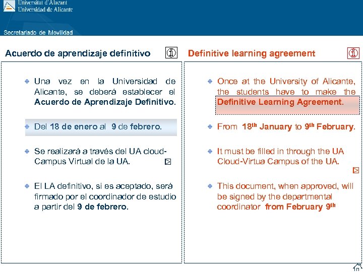 Acuerdo de aprendizaje definitivo Definitive learning agreement Una vez en la Universidad de Alicante, se deberá establecer el Acuerdo de Aprendizaje Definitivo. Once at the University of Alicante, the students have to make the Definitive Learning Agreement. Del 18 de enero al 9 de febrero. From 18 th January to 9 th February. Se realizará a través del UA cloud. Campus Virtual de la UA. It must be filled in through the UA Cloud-Virtua Campus of the UA. El LA definitivo, si es aceptado, será firmado por el coordinador de estudio a partir del 9 de febrero. This document, when approved, will be signed by the departmental coordinator from February 9 th