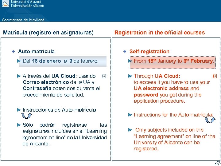 Matrícula (registro en asignaturas) Auto-matrícula Registration in the official courses Self-registration Del 18 de enero al 9 de febrero. From 18 th January to 9 th February. A través del UA Cloud: usando Correo electrónico de la UA y Contraseña obtenidos durante el procedimiento de solicitud. Through UA Cloud: to access it you have to use your UA electronic address and password you got during the application procedure. Instrucciones de Auto-matrícula Sólo podrán registrarse las asignaturas incluídas en el “Learning agreement on line” de la Universidad de Alicante. Instructions for the Auto-matrícula. Only subjects included on the “Learning agreement” on line of the University of Alicante can be registered.