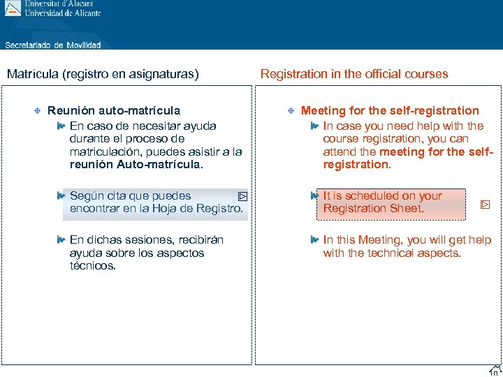 Matrícula (registro en asignaturas) Reunión auto-matrícula En caso de necesitar ayuda durante el proceso de matriculación, puedes asistir a la reunión Auto-matrícula. Registration in the official courses Meeting for the self-registration In case you need help with the course registration, you can attend the meeting for the selfregistration. Según cita que puedes encontrar en la Hoja de Registro. It is scheduled on your Registration Sheet. En dichas sesiones, recibirán ayuda sobre los aspectos técnicos. In this Meeting, you will get help with the technical aspects.