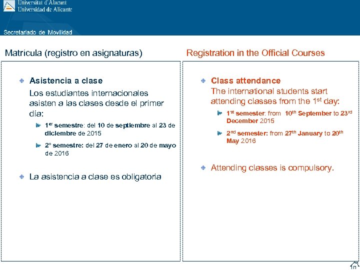 Matrícula (registro en asignaturas) Asistencia a clase Los estudiantes internacionales asisten a las clases desde el primer día: 1 er semestre: del 10 de septiembre al 23 de diciembre de 2015 2º semestre: del 27 de enero al 20 de mayo de 2016 La asistencia a clase es obligatoria Registration in the Official Courses Class attendance The international students start attending classes from the 1 st day: 1 st semester: from 10 th September to 23 rd December 2015 2 nd semester: from 27 th January to 20 th May 2016 Attending classes is compulsory.