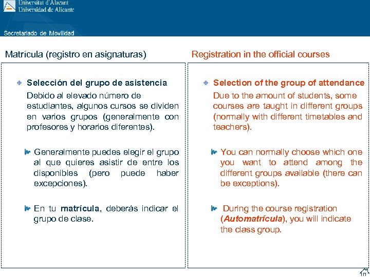 Matrícula (registro en asignaturas) Registration in the official courses Selección del grupo de asistencia Debido al elevado número de estudiantes, algunos cursos se dividen en varios grupos (generalmente con profesores y horarios diferentes). Selection of the group of attendance Due to the amount of students, some courses are taught in different groups (normally with different timetables and teachers). Generalmente puedes elegir el grupo al que quieres asistir de entre los disponibles (pero puede haber excepciones). You can normally choose which one you want to attend among the different groups available (there can be exceptions). En tu matrícula, deberás indicar el grupo de clase. During the course registration (Automatrícula), you will indicate the class group.