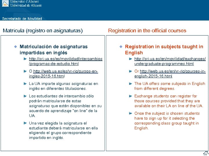 Matrícula (registro en asignaturas) Matriculación de asignaturas impartidas en inglés Registration in the official courses Registration in subjects taught in English http: //sri. ua. es/es/movilidad/intercambios /programas-de-estudio. html http: //sri. ua. es/en/movilidad/exchanges/ undergraduate-programmes. html O http: //web. ua. es/es/vr-ric/cursos-eningles-2015 -16. html Or http: //web. ua. es/en/vr-ric/courses-inenglish-2015 -16. html La UA imparte algunas asignaturas en inglés en diferentes titulaciones. The UA offers some subjects in English from different degrees. Los estudiantes de intercambio sólo podrán matricularse de estas asignaturas que estén disponibles en su acuerdo de aprendizaje “on line” de la UA. Exchange students can register for those courses provided that they are available on their LA on line of the UA. Una vez elegida la asignatura el estudiante deberá matricularse en ella eligiendo el grupo correspondiente impartido en inglés. Once the subject is chosen students have to sign up for it selecting the corresponding class group taught in English.