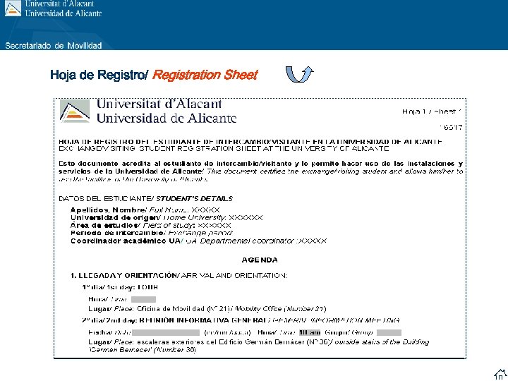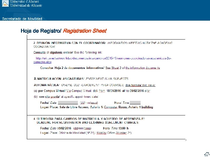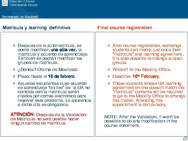 Matrícula y learning definitivo Final course registration Después de la automatrícula, se podrá modificar, una sóla vez, la matrícula y acuerdo de aprendizaje. También se podrán modificar los grupos de matrícula. After course registration, exchange students can modiy, just once their “matrícula” and learning agreement. It is also possible to change subject groups. ¿Dónde? Oficina de Movilidad. Where? At the Mobility Office. Plazo: hasta el 16 de febrero. Deadline: 16 th February. Aquellos estudiantes cuyo acuerdo de aprendizaje “on line” de la UA no coincida con la matrícula serán citados por correo electrónico para resolver este problema. La asistencia a dicha cita es obligatoria. Those students whose UA learning agreement on line doesn’t match the “matrícula” contents will be required to go to the Mobility Office to arrange this matter. Attending this appointment is compulsory. ATENCIÓN: Después de la Validación de Matrícula no será posible hacer ningún cambio de matrícula. NOTE: After the Validation, it won't be possible to do any modification in the course enrolment.