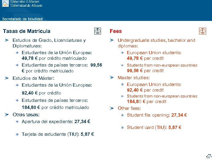 Tasas de Matrícula Fees Estudios de Grado, Licenciaturas y Diplomaturas: Estudiantes de la Unión Europea: 49, 78 € por crédito matriculado Estudiantes de países terceros: 99, 56 € por crédito matriculado Estudios de Máster: Estudiantes de la Unión Europea: 92, 40 € por crédito Estudiantes de países terceros: 184, 80 € por crédito matriculado Otras tasas: Undergraduate studies, bachelor and diplomas: European Union students: 49, 78 € per credit Students from non-european countries: 99, 56 € per credit Master studies: European Union students: 92, 40 € per credit Students from non-european countries: 184, 80 € per credit Other fees: Student file opening: 27, 34 € Apertura del expediente: 27, 34 € Student card (TIU): 5, 87 € Tarjeta de estudiante (TIU): 5, 87 €