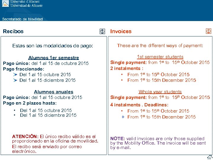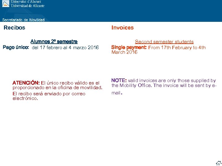 Recibos Invoices Alumnos 2º semestre Pago único: del 17 febrero al 4 marzo 2016 Second semester students Single payment: From 17 th February to 4 th March 2016 ATENCIÓN: El único recibo válido es el proporcionado en la oficina de movilidad. El recibo será enviado por correo electrónico. NOTE: valid invoices are only those supplied by the Mobility Office. The invoice will be sent by email .