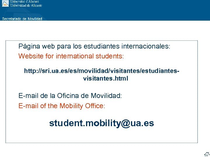Página web para los estudiantes internacionales: Website for international students: http: //sri. ua. es/es/movilidad/visitantes/estudiantesvisitantes. html E-mail de la Oficina de Movilidad: E-mail of the Mobility Office: student. mobility@ua. es