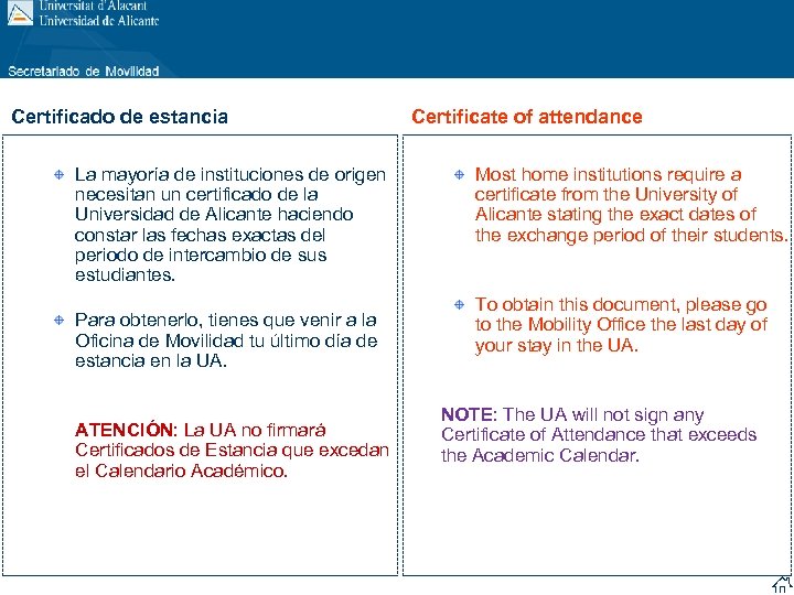 Certificado de estancia La mayoría de instituciones de origen necesitan un certificado de la Universidad de Alicante haciendo constar las fechas exactas del periodo de intercambio de sus estudiantes. Para obtenerlo, tienes que venir a la Oficina de Movilidad tu último día de estancia en la UA. ATENCIÓN: La UA no firmará Certificados de Estancia que excedan el Calendario Académico. Certificate of attendance Most home institutions require a certificate from the University of Alicante stating the exact dates of the exchange period of their students. To obtain this document, please go to the Mobility Office the last day of your stay in the UA. NOTE: The UA will not sign any Certificate of Attendance that exceeds the Academic Calendar.