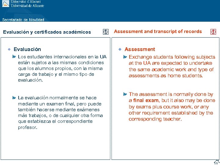 Evaluación y certificados académicos Evaluación Los estudiantes internacionales en la UA están sujetos a las mismas condiciones que los alumnos propios, con la misma carga de trabajo y el mismo tipo de evaluación. La evaluación normalmente se hace mediante un examen final, pero puede también hacerse mediante exámenes más trabajos, o de cualquier otra forma que establezca el correspondiente profesor. Assessment and transcript of records Assessment Exchange students following subjects at the UA are expected to undertake the same academic work and type of assessments as home students. The assessment is normally done by a final exam, but it also may be done by exams plus course work, or any other requirement established by the corresponding teacher.