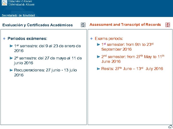 Evaluación y Certificados Académicos Periodos exámenes: 1 er semestre: del 9 al 23 de enero de 2016 Assessment and Transcript of Records Exams periods: 1 st semester: from 9 th to 23 rd September 2016 2º semestre: del 27 de mayo al 11 de junio 2016 2 nd semester: from 27 th May to 11 th June 2016 Recuperaciones: 27 junio - 13 julio 2016 Resits: 27 th June – 13 rd July 2016