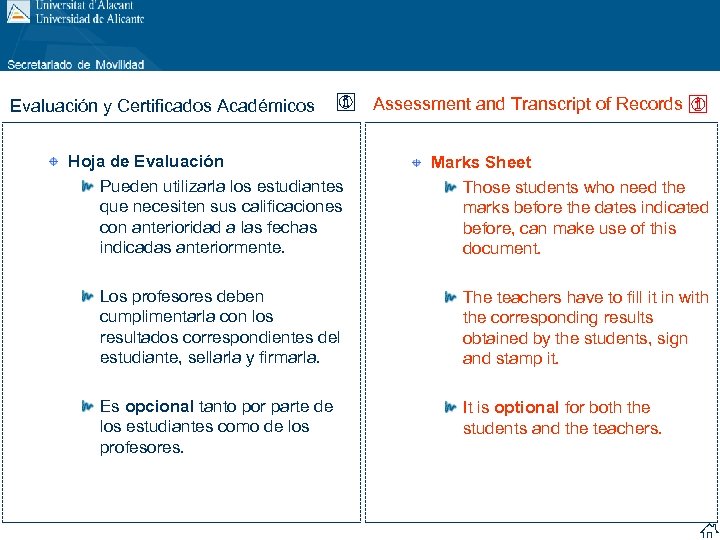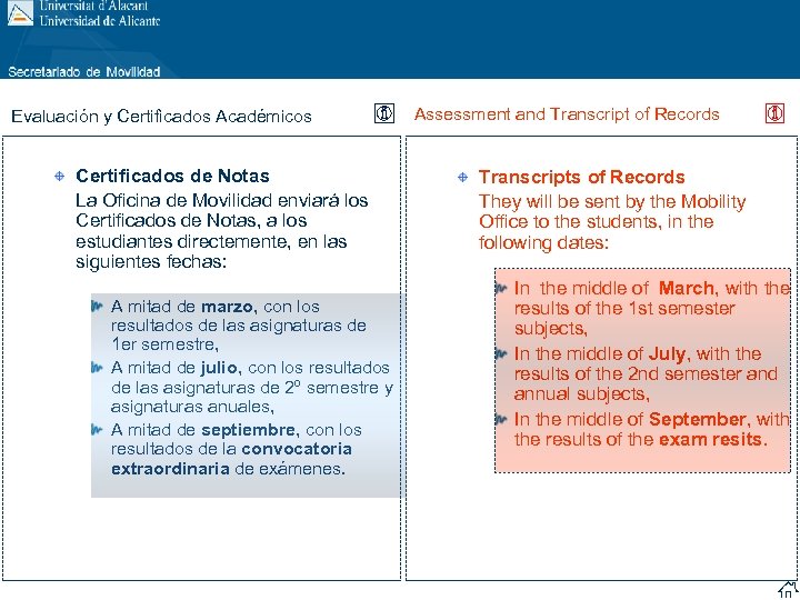 Evaluación y Certificados Académicos Certificados de Notas La Oficina de Movilidad enviará los Certificados de Notas, a los estudiantes directemente, en las siguientes fechas: A mitad de marzo, con los resultados de las asignaturas de 1 er semestre, A mitad de julio, con los resultados de las asignaturas de 2º semestre y asignaturas anuales, A mitad de septiembre, con los resultados de la convocatoria extraordinaria de exámenes. Assessment and Transcript of Records Transcripts of Records They will be sent by the Mobility Office to the students, in the following dates: In the middle of March, with the results of the 1 st semester subjects, In the middle of July, with the results of the 2 nd semester and annual subjects, In the middle of September, with the results of the exam resits.