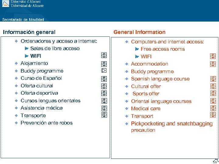 Información general Ordenadores y acceso a internet: Salas de libre acceso WIFI Alojamiento Buddy programme Curso de Español Oferta cultural Oferta deportiva Cursos lenguas orientales Asistencia médica Transporte Prevención ante robos General Information Computers and internet access: Free access rooms WIFI Accommodation Buddy programme Spanish language course Cultural offer Sports offer Oriental language courses Medical care Transport Pickpocketing and snatchbagging precaution