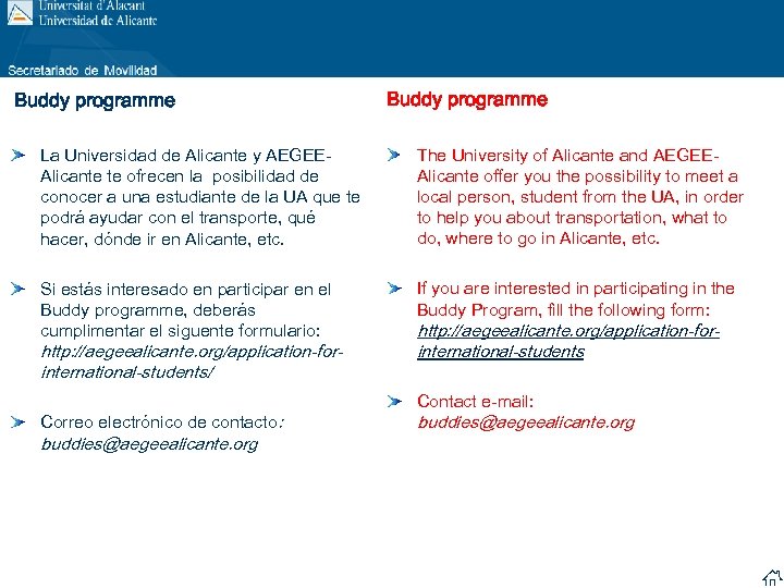Buddy programme La Universidad de Alicante y AEGEEAlicante te ofrecen la posibilidad de conocer a una estudiante de la UA que te podrá ayudar con el transporte, qué hacer, dónde ir en Alicante, etc. The University of Alicante and AEGEEAlicante offer you the possibility to meet a local person, student from the UA, in order to help you about transportation, what to do, where to go in Alicante, etc. Si estás interesado en participar en el Buddy programme, deberás cumplimentar el siguente formulario: If you are interested in participating in the Buddy Program, fill the following form: http: //aegeealicante. org/application-forinternational-students/ Correo electrónico de contacto: buddies@aegeealicante. org http: //aegeealicante. org/application-forinternational-students Contact e-mail: buddies@aegeealicante. org