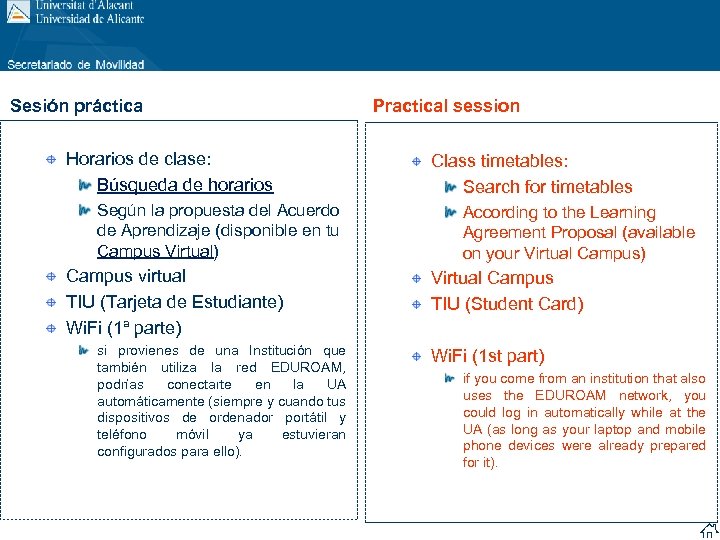 Sesión práctica Horarios de clase: Búsqueda de horarios Según la propuesta del Acuerdo de Aprendizaje (disponible en tu Campus Virtual) Campus virtual TIU (Tarjeta de Estudiante) Wi. Fi (1ª parte) si provienes de una Institución que también utiliza la red EDUROAM, podrías conectarte en la UA automáticamente (siempre y cuando tus dispositivos de ordenador portátil y teléfono móvil ya estuvieran configurados para ello). Practical session Class timetables: Search for timetables According to the Learning Agreement Proposal (available on your Virtual Campus) Virtual Campus TIU (Student Card) Wi. Fi (1 st part) if you come from an institution that also uses the EDUROAM network, you could log in automatically while at the UA (as long as your laptop and mobile phone devices were already prepared for it).