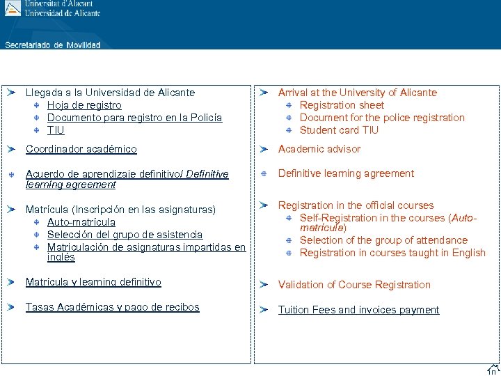 Llegada a la Universidad de Alicante Hoja de registro Documento para registro en la Policía TIU Arrival at the University of Alicante Registration sheet Document for the police registration Student card TIU Coordinador académico Academic advisor Acuerdo de aprendizaje definitivo/ Definitive learning agreement Matrícula (Inscripción en las asignaturas) Auto-matrícula Selección del grupo de asistencia Matriculación de asignaturas impartidas en inglés Registration in the official courses Self-Registration in the courses (Automatrícula) Selection of the group of attendance Registration in courses taught in English Matrícula y learning definitivo Validation of Course Registration Tasas Académicas y pago de recibos Tuition Fees and invoices payment