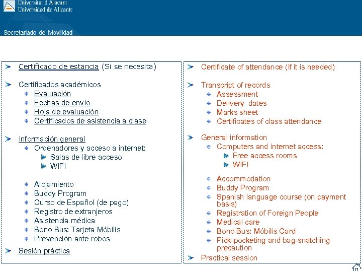 Certificado de estancia (Si se necesita) Certificate of attendance (If it is needed) Certificados académicos Evaluación Fechas de envío Hoja de evaluación Certificados de asistencia a clase Transcript of records Assessment Delivery dates Marks sheet Certificates of class attendance Información general Ordenadores y acceso a internet: Salas de libre acceso WIFI General information Computers and internet access: Free access rooms WIFI Alojamiento Buddy Program Curso de Español (de pago) Registro de extranjeros Asistencia médica Bono Bus: Tarjeta Móbilis Prevención ante robos Sesión práctica Accommodation Buddy Program Spanish language course (on payment basis) Registration of Foreign People Medical care Bono Bus: Móbilis Card Pick-pocketing and bag-snatching precaution Practical session