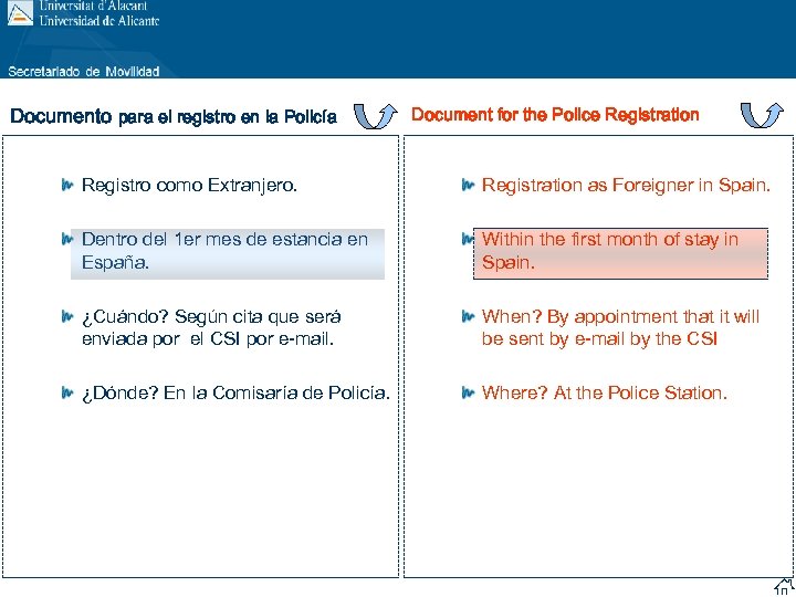 Documento para el registro en la Policía Document for the Police Registration Registro como Extranjero. Registration as Foreigner in Spain. Dentro del 1 er mes de estancia en España. Within the first month of stay in Spain. ¿Cuándo? Según cita que será enviada por el CSI por e-mail. When? By appointment that it will be sent by e-mail by the CSI ¿Dónde? En la Comisaría de Policía. Where? At the Police Station.