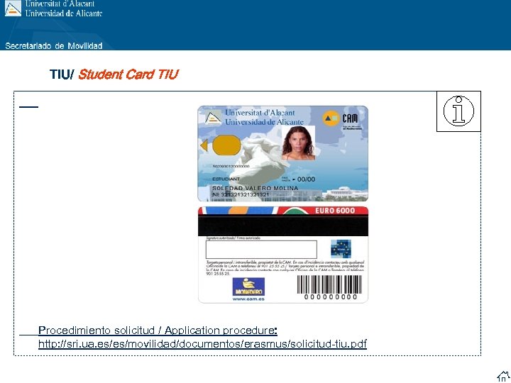 TIU/ Student Card TIU Procedimiento solicitud / Application procedure: http: //sri. ua. es/es/movilidad/documentos/erasmus/solicitud-tiu. pdf