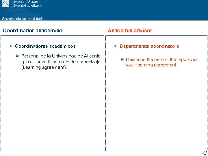 Coordinador académico Coordinadores académicos Personal de la Universidad de Alicante que autoriza tu contrato de aprendizaje (Learning agreement). Academic advisor Departmental aoordinators He/she is the person that approves your learning agreement.