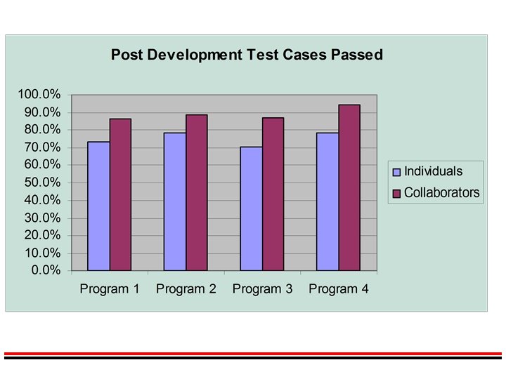 Distributed Pair Programming Ø Ø Ø Ø Net Meeting Yahoo Messenger Graduate Object-Oriented class at NCSU 5 -week project 132 students 34 distance students Teams of 2 -4 students Ø Colocated non-pairs (9 groups) Ø Colocated pairs (16 groups) Ø Distance non-pairs (8 groups) Ø Distance pairs (5 groups)