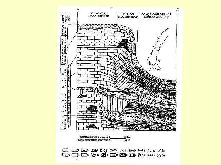 Североновеземельская часть включает единый NP 3 -MZ 1 комплекс, залегающий непосредственно на PP(? ) - MP кристаллическом фундаменте Свальбардской плиты. Комплексы основания представлены слабометаморфизованными (до филлитов) песчано-глинистыми отложениями, содержащими вендские микрофоссилии и перекрываются слоями с остатками кембрийских трилобитов. Граница между протерозоем и палеозоем согласная, постепенная. Флишоидные и сланцевые формации верхнего докембрия вместе с перекрывающими их граптолитсодержащими толщами кембрия-силура образуют единый структурно-вещественный комплекс, состоящий из флишоидных глубоководных формаций верхнего протерозоясреднего ордовика и флишоидно-молассоидных известково-глинистых формаций верхнего ордовика-силура.