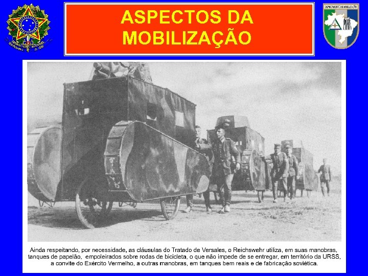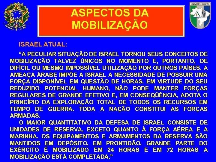 ASPECTOS DA MOBILIZAÇÃO ISRAEL ATUAL: “A PECULIAR SITUAÇÃO DE ISRAEL TORNOU SEUS CONCEITOS DE MOBILIZAÇÃO TALVEZ ÚNICOS NO MOMENTO E, PORTANTO, DE DIFÍCIL OU MESMO IMPOSSÍVEL UTILIZAÇÃO POR OUTROS PAÍSES. A AMEAÇA ÁRABE IMPÕE A ISRAEL A NECESSIDADE DE POSSUIR UMA FORÇA DISPONÍVEL EM QUESTÃO DE HORAS. EM VIRTUDE DO SEU REDUZIDO POTENCIAL HUMANO, NÃO PODE MANTER FORÇAS REGULARES DE GRANDE EFETIVO E, EM CONSEQÜÊNCIA, ADOTA O PRINCÍPIO DA EXPLORAÇÃO TOTAL DE TODOS OS RECURSOS EM TEMPO DE GUERRA. TODA A NAÇÃO CONSTITUI AS FORÇAS ARMADAS. O MAIOR QUANTITATIVO DA DEFESA DE ISRAEL CONSISTE DE UNIDADES DE RESERVA, EXCETO QUANTO À FORÇA AÉREA E A MARINHA. OS EQUIPAMENTOS E ARMAMENTOS DA RESERVA SÃO MANTIDOS EM DEPÓSITO, EM PRONTIDÃO. GRANDE PARTE DO EXÉRCITO É MOBILIZADO EM 24 HORAS E EM 72 HORAS A MOBILIZAÇÃO ESTÁ COMPLETADA. ”