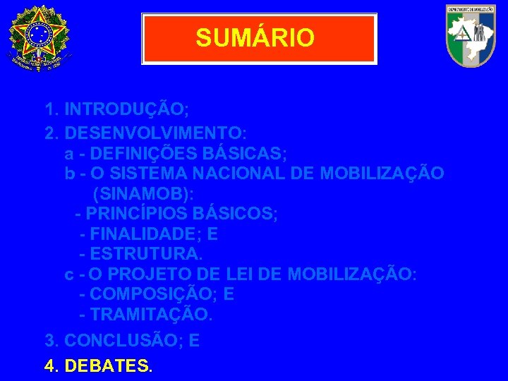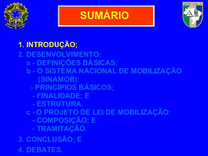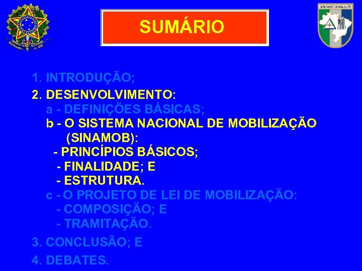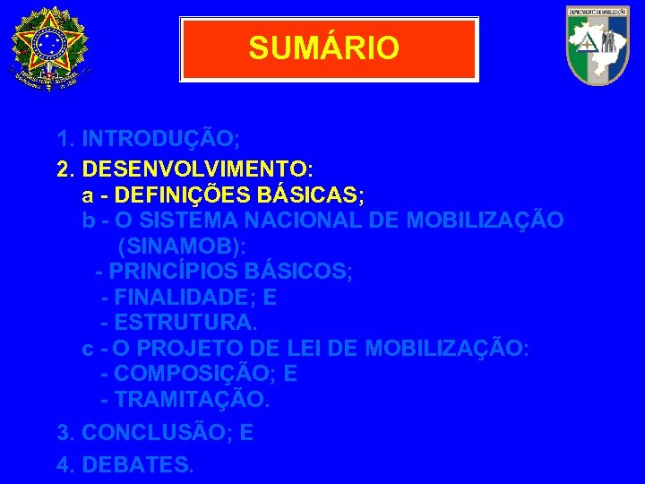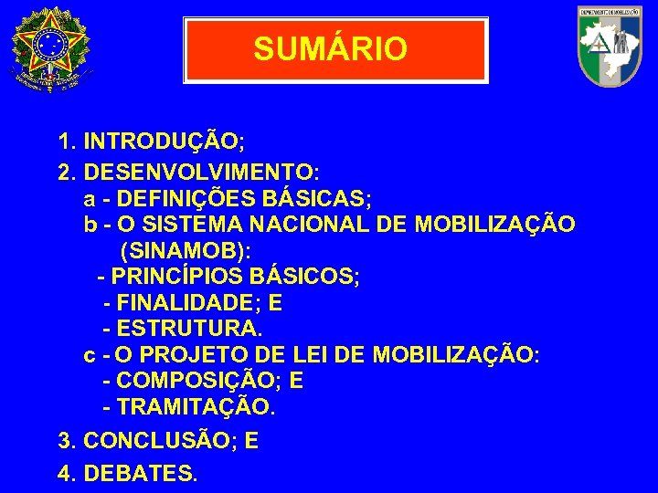 SUMÁRIO 1. INTRODUÇÃO; 2. DESENVOLVIMENTO: a - DEFINIÇÕES BÁSICAS; b - O SISTEMA NACIONAL DE MOBILIZAÇÃO (SINAMOB): - PRINCÍPIOS BÁSICOS; - FINALIDADE; E - ESTRUTURA. c - O PROJETO DE LEI DE MOBILIZAÇÃO: - COMPOSIÇÃO; E - TRAMITAÇÃO. 3. CONCLUSÃO; E 4. DEBATES.