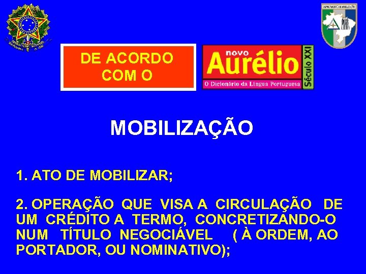 DE ACORDO COM O MOBILIZAÇÃO 1. ATO DE MOBILIZAR; 2. OPERAÇÃO QUE VISA A CIRCULAÇÃO DE UM CRÉDITO A TERMO, CONCRETIZANDO-O NUM TÍTULO NEGOCIÁVEL ( À ORDEM, AO PORTADOR, OU NOMINATIVO);