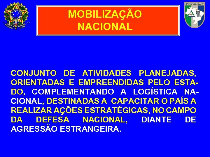 MOBILIZAÇÃO NACIONAL CONJUNTO DE ATIVIDADES PLANEJADAS, ORIENTADAS E EMPREENDIDAS PELO ESTADO, COMPLEMENTANDO A LOGÍSTICA NACIONAL, DESTINADAS A CAPACITAR O PAÍS A REALIZAR AÇÕES ESTRATÉGICAS, NO CAMPO DA DEFESA NACIONAL, DIANTE DE AGRESSÃO ESTRANGEIRA.