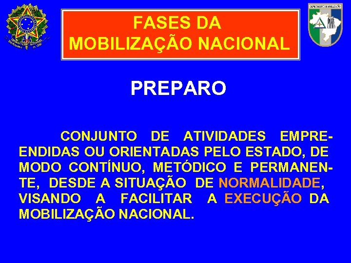 FASES DA MOBILIZAÇÃO NACIONAL PREPARO CONJUNTO DE ATIVIDADES EMPREENDIDAS OU ORIENTADAS PELO ESTADO, DE MODO CONTÍNUO, METÓDICO E PERMANENTE, DESDE A SITUAÇÃO DE NORMALIDADE, VISANDO A FACILITAR A EXECUÇÃO DA MOBILIZAÇÃO NACIONAL.