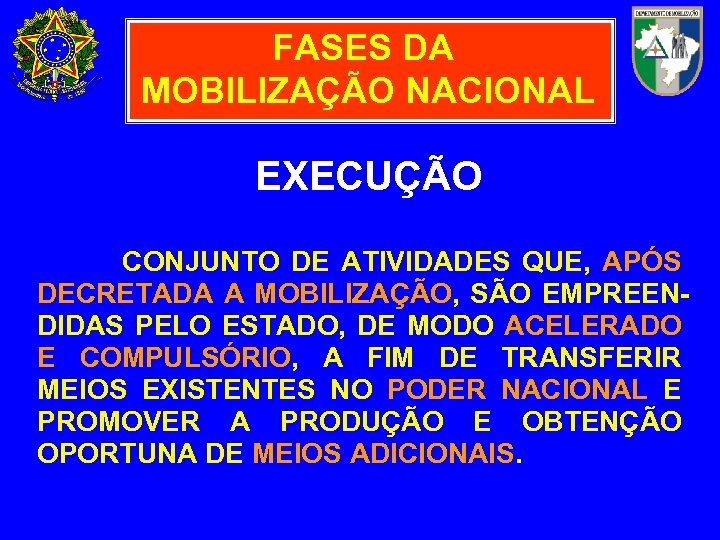 FASES DA MOBILIZAÇÃO NACIONAL EXECUÇÃO CONJUNTO DE ATIVIDADES QUE, APÓS DECRETADA A MOBILIZAÇÃO, SÃO EMPREENDIDAS PELO ESTADO, DE MODO ACELERADO E COMPULSÓRIO, A FIM DE TRANSFERIR MEIOS EXISTENTES NO PODER NACIONAL E PROMOVER A PRODUÇÃO E OBTENÇÃO OPORTUNA DE MEIOS ADICIONAIS.
