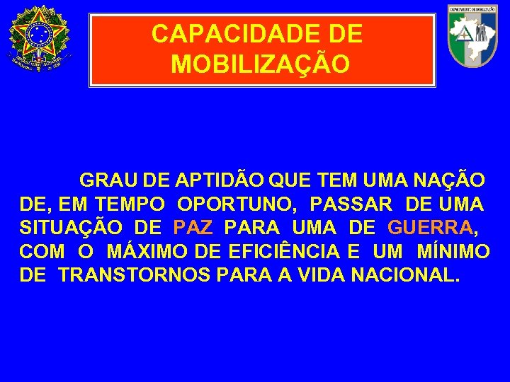 CAPACIDADE DE MOBILIZAÇÃO GRAU DE APTIDÃO QUE TEM UMA NAÇÃO DE, EM TEMPO OPORTUNO, PASSAR DE UMA SITUAÇÃO DE PAZ PARA UMA DE GUERRA, COM O MÁXIMO DE EFICIÊNCIA E UM MÍNIMO DE TRANSTORNOS PARA A VIDA NACIONAL.