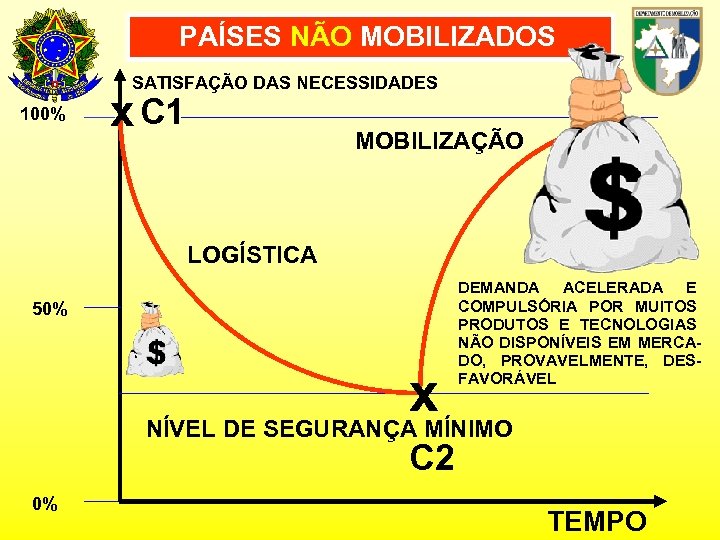 PAÍSES NÃO MOBILIZADOS SATISFAÇÃO DAS NECESSIDADES 100% x C 1 MOBILIZAÇÃO LOGÍSTICA DEMANDA ACELERADA E COMPULSÓRIA POR MUITOS PRODUTOS E TECNOLOGIAS NÃO DISPONÍVEIS EM MERCADO, PROVAVELMENTE, DESFAVORÁVEL 50% x NÍVEL DE SEGURANÇA MÍNIMO C 2 0% TEMPO