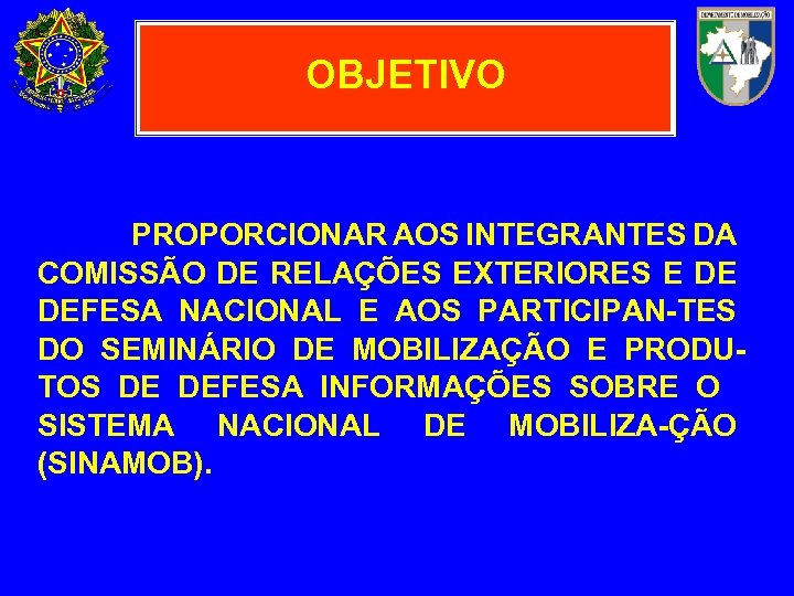 OBJETIVO PROPORCIONAR AOS INTEGRANTES DA COMISSÃO DE RELAÇÕES EXTERIORES E DE DEFESA NACIONAL E AOS PARTICIPAN-TES DO SEMINÁRIO DE MOBILIZAÇÃO E PRODUTOS DE DEFESA INFORMAÇÕES SOBRE O SISTEMA NACIONAL DE MOBILIZA-ÇÃO (SINAMOB).