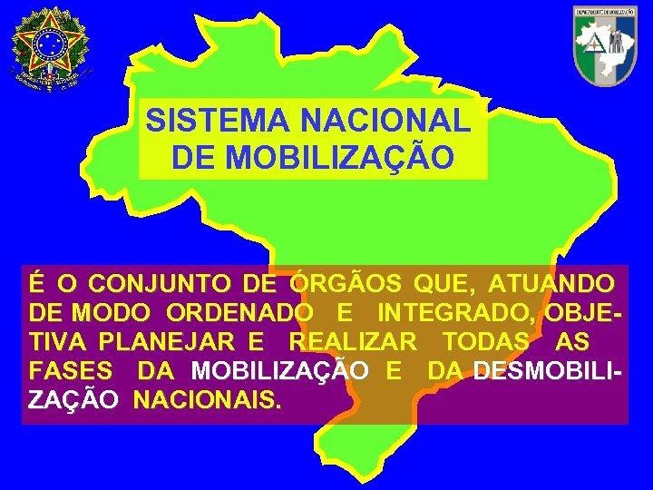 SISTEMA NACIONAL DE MOBILIZAÇÃO É O CONJUNTO DE ÓRGÃOS QUE, ATUANDO DE MODO ORDENADO E INTEGRADO, OBJETIVA PLANEJAR E REALIZAR TODAS AS FASES DA MOBILIZAÇÃO E DA DESMOBILIZAÇÃO NACIONAIS.