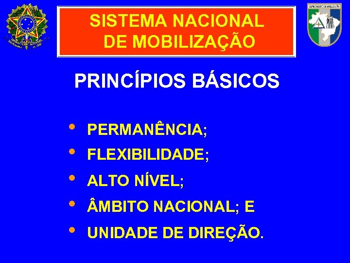 SISTEMA NACIONAL DE MOBILIZAÇÃO PRINCÍPIOS BÁSICOS • PERMANÊNCIA; • FLEXIBILIDADE; • ALTO NÍVEL; • MBITO NACIONAL; E • UNIDADE DE DIREÇÃO.