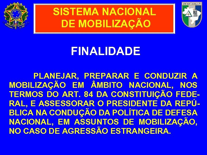 SISTEMA NACIONAL DE MOBILIZAÇÃO FINALIDADE PLANEJAR, PREPARAR E CONDUZIR A MOBILIZAÇÃO EM MBITO NACIONAL, NOS TERMOS DO ART. 84 DA CONSTITUIÇÃO FEDERAL, E ASSESSORAR O PRESIDENTE DA REPÚBLICA NA CONDUÇÃO DA POLÍTICA DE DEFESA NACIONAL, EM ASSUNTOS DE MOBILIZAÇÃO, NO CASO DE AGRESSÃO ESTRANGEIRA.