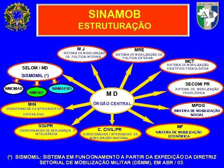 SINAMOB ESTRUTURAÇÃO M J SISTEMA DE MOBILIZAÇÃO DE POLÍTICA INTERNA MRE SISTEMA DE MOBILIZAÇÃO DE POLÍTICA EXTERNA MCT SISTEMA DE MOBILIZAÇÃO CIENTÍFICO-TECNOLÓGICA SELOM / MD SISMOMIL (*) SIMOMAR SIMOBE SISMAERO SECOM/ PR M D SISTEMA DE MOBILIZAÇÃO PSICOLÓGICA ÓRGÃO CENTRAL MIN COORDENADOR DE ATIVIDADES DE SISTEMA DE MOBILIZAÇÃO SOCIAL DEFESA CIVIL GSI/PR COORDENADOR DE SEGURANÇA E INTELIGÊNCIA MPOG C. CIVIL/PR COORDENADOR / INTEGRADOR DE MOBILIZAÇÃO NACIONAL MF SISTEMA DE MOBILIZAÇÃO ECONÔMICA (*) SISMOMIL: SISTEMA EM FUNCIONAMENTO A PARTIR DA EXPEDIÇÃO DA DIRETRIZ SETORIAL DE MOBILIZAÇÃO MILITAR (DSMM), EM ABR / 03.