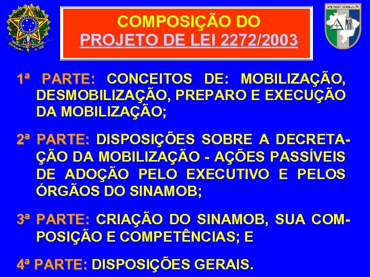 COMPOSIÇÃO DO PROJETO DE LEI 2272/2003 1ª PARTE: CONCEITOS DE: MOBILIZAÇÃO, PARTE: DESMOBILIZAÇÃO, PREPARO E EXECUÇÃO DA MOBILIZAÇÃO; 2ª PARTE: DISPOSIÇÕES SOBRE A DECRETAPARTE: ÇÃO DA MOBILIZAÇÃO - AÇÕES PASSÍVEIS DE ADOÇÃO PELO EXECUTIVO E PELOS ÓRGÃOS DO SINAMOB; 3ª PARTE: CRIAÇÃO DO SINAMOB, SUA COMPARTE: POSIÇÃO E COMPETÊNCIAS; E 4ª PARTE: DISPOSIÇÕES GERAIS. 4ª PARTE: