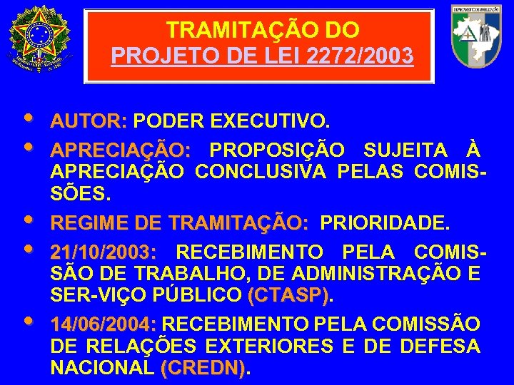 TRAMITAÇÃO DO PROJETO DE LEI 2272/2003 • • • AUTOR: PODER EXECUTIVO. AUTOR: APRECIAÇÃO: PROPOSIÇÃO SUJEITA À APRECIAÇÃO: APRECIAÇÃO CONCLUSIVA PELAS COMISSÕES. REGIME DE TRAMITAÇÃO: PRIORIDADE. REGIME DE TRAMITAÇÃO: 21/10/2003: RECEBIMENTO PELA COMISSÃO DE TRABALHO, DE ADMINISTRAÇÃO E SER-VIÇO PÚBLICO (CTASP) 14/06/2004: RECEBIMENTO PELA COMISSÃO DE RELAÇÕES EXTERIORES E DE DEFESA NACIONAL (CREDN)