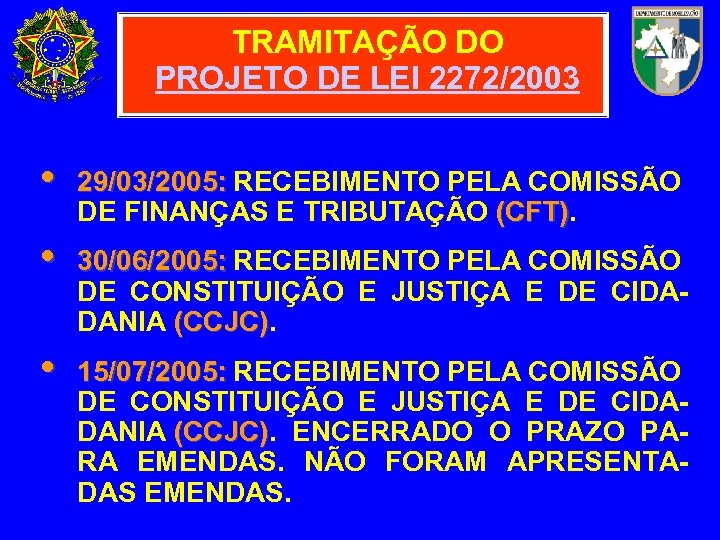 TRAMITAÇÃO DO PROJETO DE LEI 2272/2003 • 29/03/2005: RECEBIMENTO PELA COMISSÃO DE FINANÇAS E TRIBUTAÇÃO (CFT) • 30/06/2005: RECEBIMENTO PELA COMISSÃO DE CONSTITUIÇÃO E JUSTIÇA E DE CIDADANIA (CCJC) • 15/07/2005: RECEBIMENTO PELA COMISSÃO DE CONSTITUIÇÃO E JUSTIÇA E DE CIDADANIA (CCJC). ENCERRADO O PRAZO PA(CCJC) RA EMENDAS. NÃO FORAM APRESENTADAS EMENDAS.