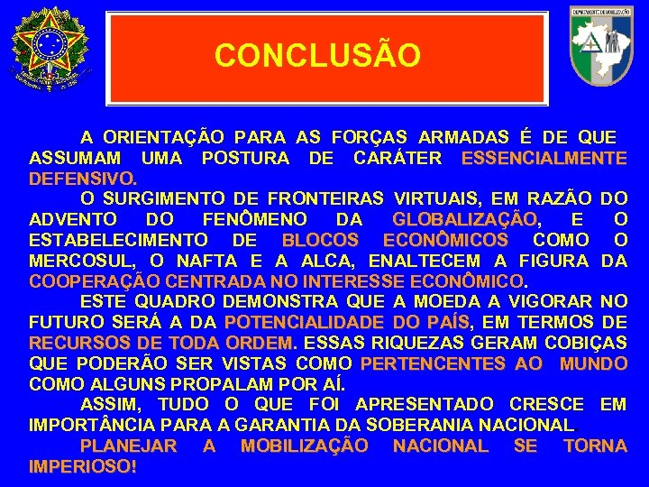 CONCLUSÃO A ORIENTAÇÃO PARA AS FORÇAS ARMADAS É DE QUE ASSUMAM UMA POSTURA DE CARÁTER ESSENCIALMENTE DEFENSIVO. O SURGIMENTO DE FRONTEIRAS VIRTUAIS, EM RAZÃO DO ADVENTO DO FENÔMENO DA GLOBALIZAÇÃO, E O GLOBALIZAÇÃO ESTABELECIMENTO DE BLOCOS ECONÔMICOS COMO O ECONÔMICOS MERCOSUL, O NAFTA E A ALCA, ENALTECEM A FIGURA DA COOPERAÇÃO CENTRADA NO INTERESSE ECONÔMICO. ESTE QUADRO DEMONSTRA QUE A MOEDA A VIGORAR NO FUTURO SERÁ A DA POTENCIALIDADE DO PAÍS, EM TERMOS DE PAÍS RECURSOS DE TODA ORDEM. ESSAS RIQUEZAS GERAM COBIÇAS ORDEM QUE PODERÃO SER VISTAS COMO PERTENCENTES AO MUNDO COMO ALGUNS PROPALAM POR AÍ. ASSIM, TUDO O QUE FOI APRESENTADO CRESCE EM IMPORT NCIA PARA A GARANTIA DA SOBERANIA NACIONAL. PLANEJAR A MOBILIZAÇÃO NACIONAL SE TORNA IMPERIOSO!
