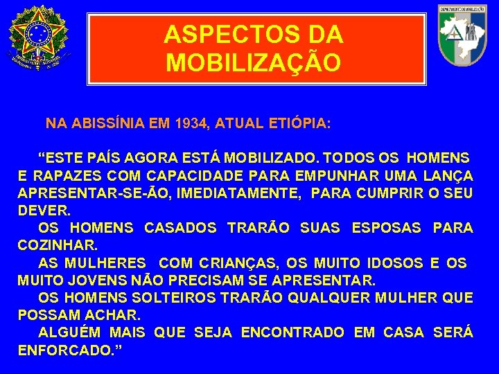 ASPECTOS DA MOBILIZAÇÃO NA ABISSÍNIA EM 1934, ATUAL ETIÓPIA: “ESTE PAÍS AGORA ESTÁ MOBILIZADO. TODOS OS HOMENS E RAPAZES COM CAPACIDADE PARA EMPUNHAR UMA LANÇA APRESENTAR-SE-ÃO, IMEDIATAMENTE, PARA CUMPRIR O SEU DEVER. OS HOMENS CASADOS TRARÃO SUAS ESPOSAS PARA COZINHAR. AS MULHERES COM CRIANÇAS, OS MUITO IDOSOS E OS MUITO JOVENS NÃO PRECISAM SE APRESENTAR. OS HOMENS SOLTEIROS TRARÃO QUALQUER MULHER QUE POSSAM ACHAR. ALGUÉM MAIS QUE SEJA ENCONTRADO EM CASA SERÁ ENFORCADO. ”