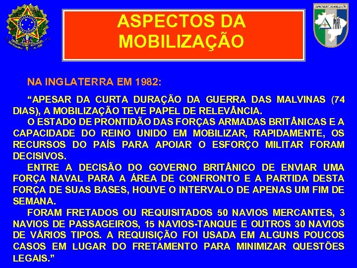 ASPECTOS DA MOBILIZAÇÃO NA INGLATERRA EM 1982: “APESAR DA CURTA DURAÇÃO DA GUERRA DAS MALVINAS (74 DIAS), A MOBILIZAÇÃO TEVE PAPEL DE RELEV NCIA. O ESTADO DE PRONTIDÃO DAS FORÇAS ARMADAS BRIT NICAS E A CAPACIDADE DO REINO UNIDO EM MOBILIZAR, RAPIDAMENTE, OS RECURSOS DO PAÍS PARA APOIAR O ESFORÇO MILITAR FORAM DECISIVOS. ENTRE A DECISÃO DO GOVERNO BRIT NICO DE ENVIAR UMA FORÇA NAVAL PARA A ÁREA DE CONFRONTO E A PARTIDA DESTA FORÇA DE SUAS BASES, HOUVE O INTERVALO DE APENAS UM FIM DE SEMANA. FORAM FRETADOS OU REQUISITADOS 50 NAVIOS MERCANTES, 3 NAVIOS DE PASSAGEIROS, 15 NAVIOS-TANQUE E OUTROS 30 NAVIOS DE VÁRIOS TIPOS. A REQUISIÇÃO FOI USADA EM ALGUNS POUCOS CASOS EM LUGAR DO FRETAMENTO PARA MINIMIZAR QUESTÕES LEGAIS. ”