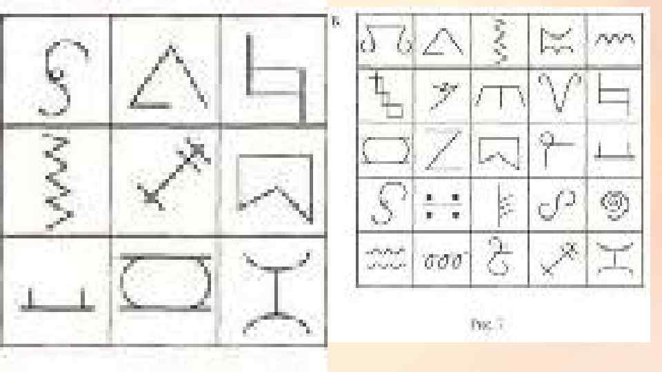 Исследование образной памяти Зрительная образная память у детей с нарушениями слуха особенно интенсивно развивается на протяжении младшего школьного возраста Методики экспресс-диагностики: Методика «Узнавание фигур» была предложена Т. Е. Рыбаковым (1911). в течение 10 с показывает испытуемому рисунок А (девять различных фигур) с установкой запомнить предъявляемые фигуры. Затем рисунок убирают, а испытуемому немедленно предъявляется рисунок Б, где все виденные схематические фигуры из рисунка А разбросаны среди других двадцати пяти фигур. В рисунке Б испытуемый должен найти первые девять фигур. При обработке результатов отмечается и подсчитывается число правильно и неправильно узнанных фигур, выводится коэффициент узнавания Е. где М — число правильно узнанных фигур, N — число неправильно узнанных фигур. Идеальный коэффициент узнавания равен единице, поэтому чем ближе результаты конкретного испытуемого к единице, тем лучше функционируют у него процессы узнавания предъявленного материала.