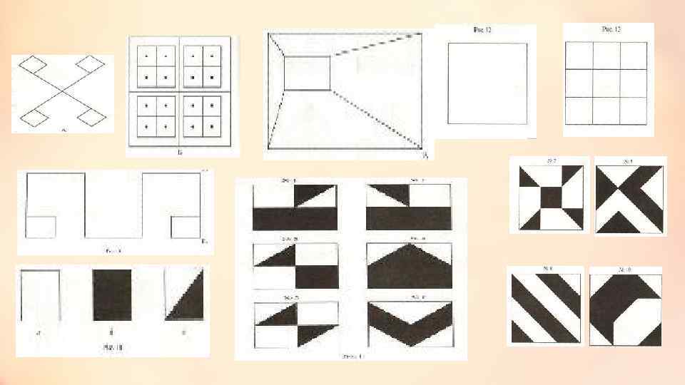 Как всё происходит Работа ведется с материалом, который состоит из набора квадратов — 10 белых (а), 10 черных (б), 10 окрашенных наполовину (в) (см. рис. 10). Карточки раскладываются на столе перед ребенком, и ему предлагают составить на макетах несколько орнаментов по образцам в порядке возрастающей сложности (рис. 11 — 13 — от № 1 до № 10). При появлении затруднений испытуемому предлагают выполнить аналогичную, но облегченную задачу по образцам на макете (рис. 14, а), затем — на макете с нанесенной сеткой (рис. 14, б). При обработке и анализе результатов выполнения задания учитывается время, затраченное на складывание одного орнамента, проводится качественный анализ процедуры его построения. Запланированное время работы над фигурами № 1— 6 (рис. 11) — по 60 с, над фигурами № 7 — 10 (рис. 12, 13) — по 120 с. Если ребенок складывает орнаменты за более короткое время, то это свидетельствует о хорошей пространственной ориентации, способности к переносу зрительного образа с карточки-образца на определенную конструкцию, которую он создает из по-разному окрашенных квадратов, о высоком уровне развития наглядно-образного мышления (развитии анализа и синтеза). У детей с сохранным интеллектом складывание орнаментов № 1 — 8 не вызывает затруднений, появление затруднений при складывании орнаментов № 9 — 10 легко преодолевается при предъявлении макетов с нанесенной сеткой.