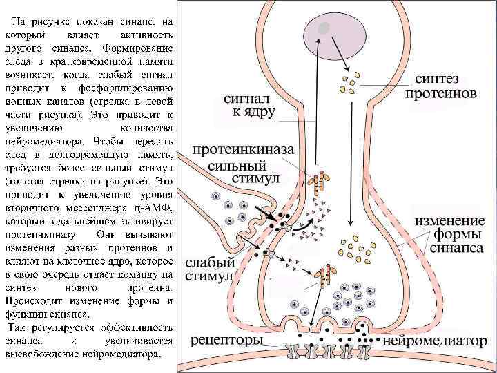 1. Сильная стимуляция деполяризует клеточную мембрану. 2. Деполяризация заставляет клетку разрядиться потенциалом действия. 3. Потенциал-чувствительные кальциевые каналы открываются. 4. Ионы кальция активируют ферменты, которые активируют CREB. 5. CREB активирует гены, ответственные за белки, усиливающие синаптическую связь. 6. Белки распространяются по всей клетке, оказывая влияние только на те синапсы, сила которых временно увеличена.