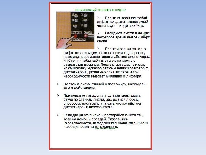 Придерживайся правила 6 «не» : 1. Не открывай дверь незнакомым людям. 2. Не ходи никуда с незнакомыми людьми, как бы они не уговаривали и чтобы интересное не предлагали. 3. Не разговаривай с незнакомыми и малознакомыми людьми, не бери от них подарки. 4. Не садись в машину с незнакомыми. 5. Не играй на улице с наступлением темноты. 6. Не входи в подъезд, лифт с незнакомыми людьми. • уходя из дома, всегда сообщай, куда идешь и как с тобой можно связаться в случае необходимости; • избегай случайных знакомств, приглашений в незнакомые компании; • сообщай по телефону, когда возвращаешься домой. • не общайся с сомнительными взрослыми людьми или подверженных криминальному влиянию сверстниками.