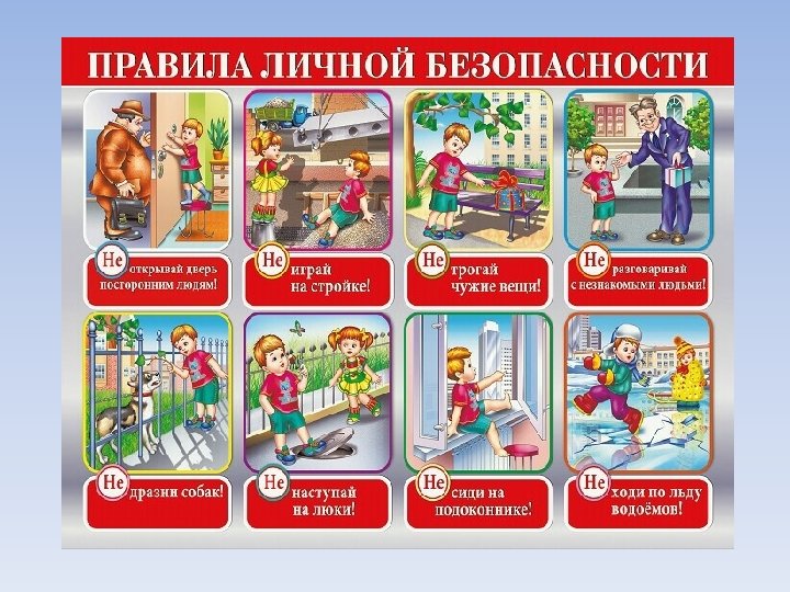 Не вступай в разговор с незнакомцами на улице Не общайся с религиозными пропагандистами Избегай общения с пьяным человеком Не впускай посторонних в свою квартиру Избегай больших скоплений людей Не садись в чужую машину без родителей Не ходи в отдаленные и безлюдные места Не принимай подарки и угощения от незнакомых людей