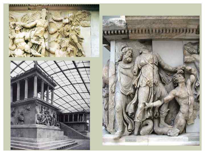 «ПЕРГАМСКИЙ АЛТАРЬ» (II В ДО Н. Э. )— ПОЛУЧИЛ НАЗВАНИЕ ПО МЕСТУ СВОЕГО СОЗДАНИЯ — ГОРОДУ ПЕРГАМУ В МАЛОЙ АЗИИ. ОСНОВНАЯ ТЕМА РЕЛЬЕФНЫХ ИЗОБРАЖЕНИЙ — БИТВА БОГОВ С ГИГАНТАМИ. В НАСТОЯЩИЙ МОМЕНТ ЭКСПОНИРУЕТСЯ В БЕРЛИНСКОМ ПЕРГАМСКОМ МУЗЕЕ (АНТИЧНОЕ СОБРАНИЕ), ПОСТРОЕННОМ СПЕЦИАЛЬНО ДЛЯ ЭТОЙ ЦЕЛИ