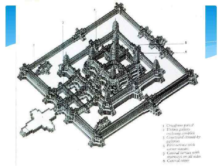 КАМПУЧИЯ Современная Кампучия находится на юго-востоке Индокитая. Древнейшим государством на этой территории было царство Фунань (I—VI вв. ). Основную часть его населения составляли древние кхмеры. Фунаньские правители пользовались титулом Царь Горы, с древности отождествляя себя с богами. Центром мироздания кхмеры считали легендарную гору богов Меру. В этом регионе храм-гора, возводимый на искусственном (насыпном) холме, стал священной резиденцией кхмерских правителей. В IX в. в стране распространился индуизм. В XI—XIII вв. кхмеры создали империю Камбуджадеша — крупнейшее в то время государство в Юго-Восточной Азии. Классический памятник искусства кхмеров — храмовый комплекс Ангкор-Ват (XII в. ). В нем воплотились религиозные идеи и лучшие достижения искусства этого народа. Комплекс выстроен на участке размером 1500 х 1300 м, обнесенным широким каналом. Через эту водную преграду к главному входу ведет дорога, вдоль которой располагаются статуи львов-охранителей и нагов. В центре комплекса, на ступенчатой горе, обнесенной стеной, возвышаются пять храмов-башен, символизирующих пять пиков горы Меру. В центральном, самом большом храме находится главное святилище.